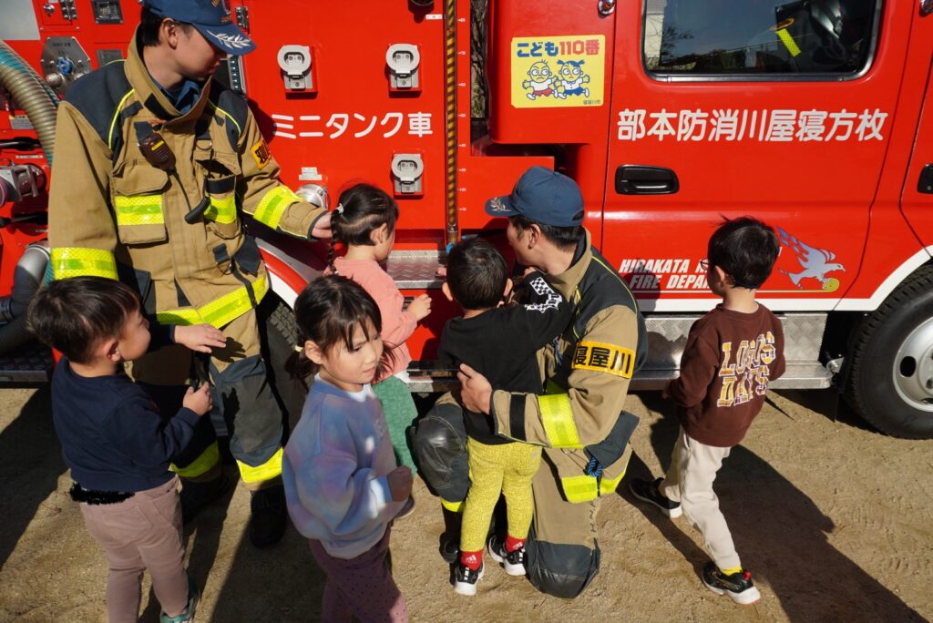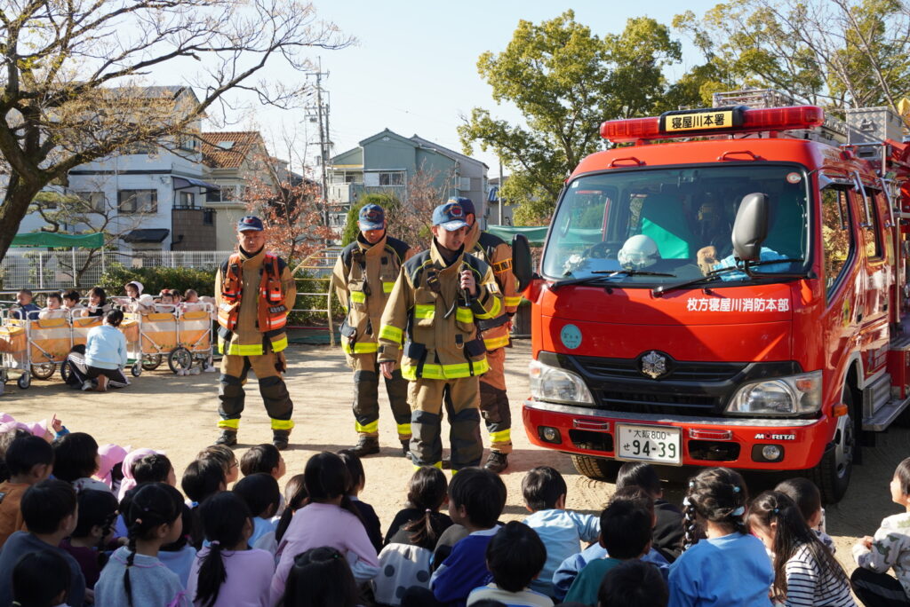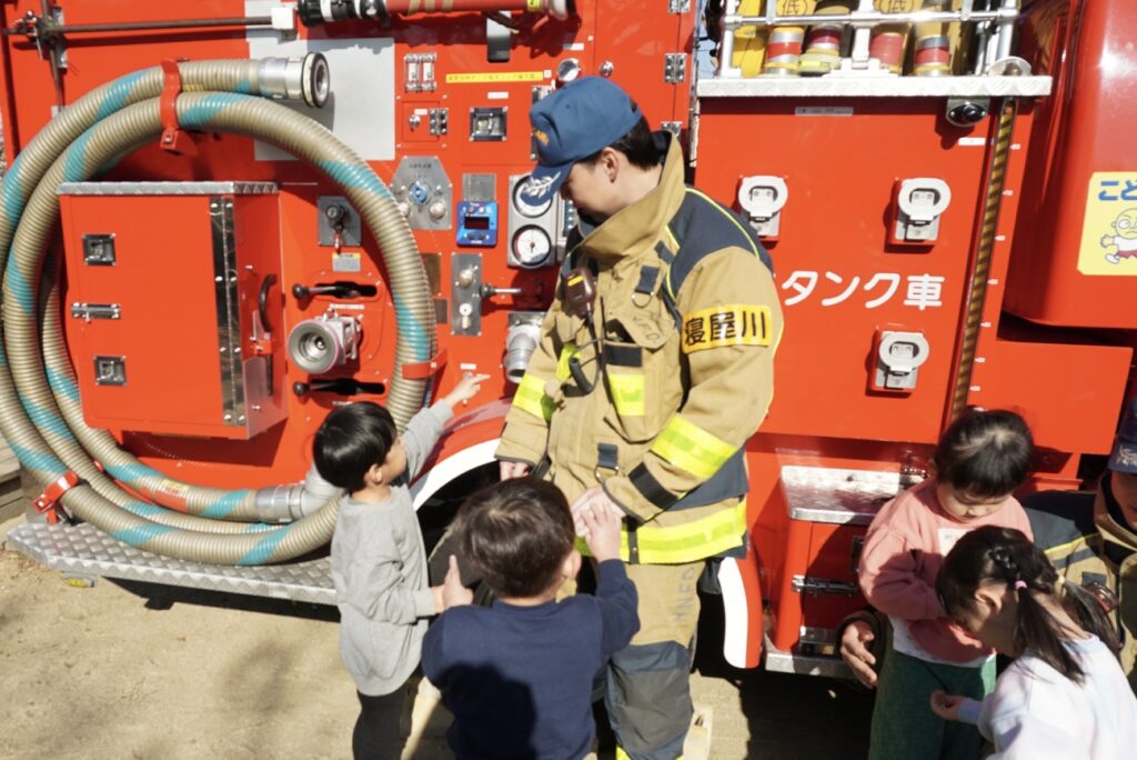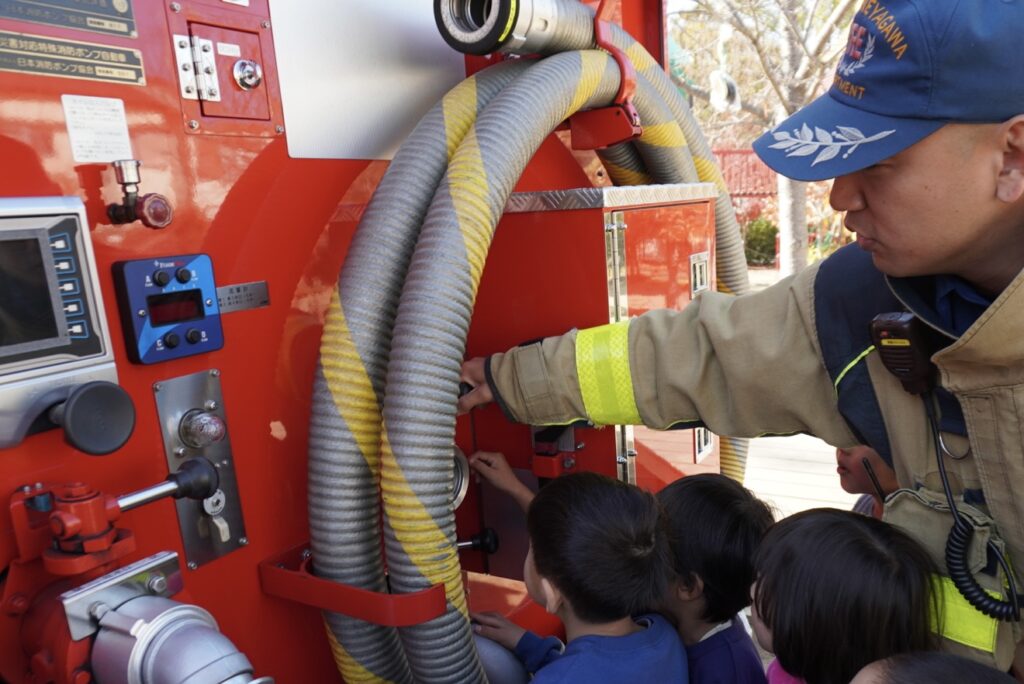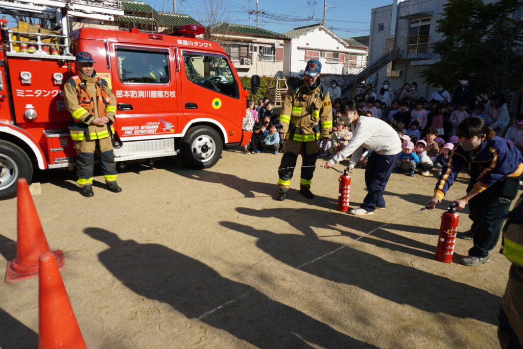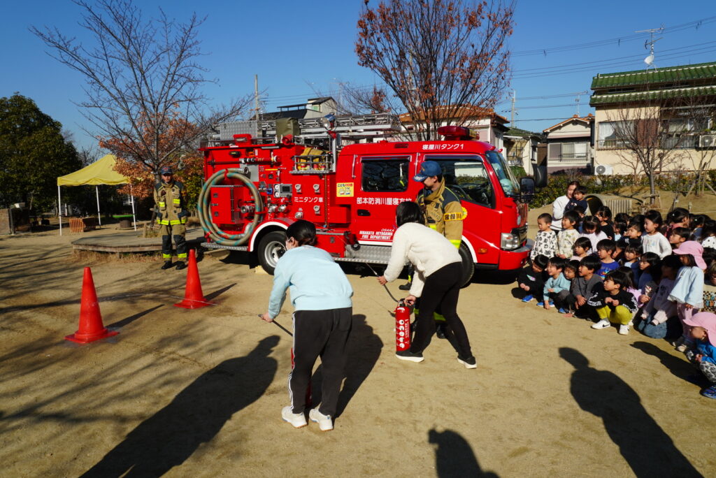 総合避難訓練 給食室からの出火を想定して、総合避難訓練を実施しました。 大きな消防車が園に出動して、子どもたちはドキドキ。 緊張しながら、先生とのお約束を守って園の駐車場に避難しました。 職員の消火訓練も行いました。 大きな消防車を目の前で見たり、触れたりしながら、消防士の皆さんのお話を聞きました。 2025年12月24日 水曜日 カテゴリー: 園の取り組み
