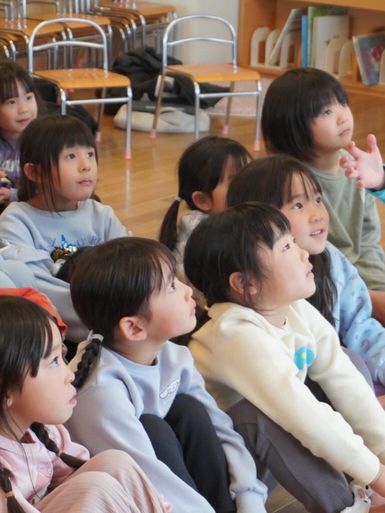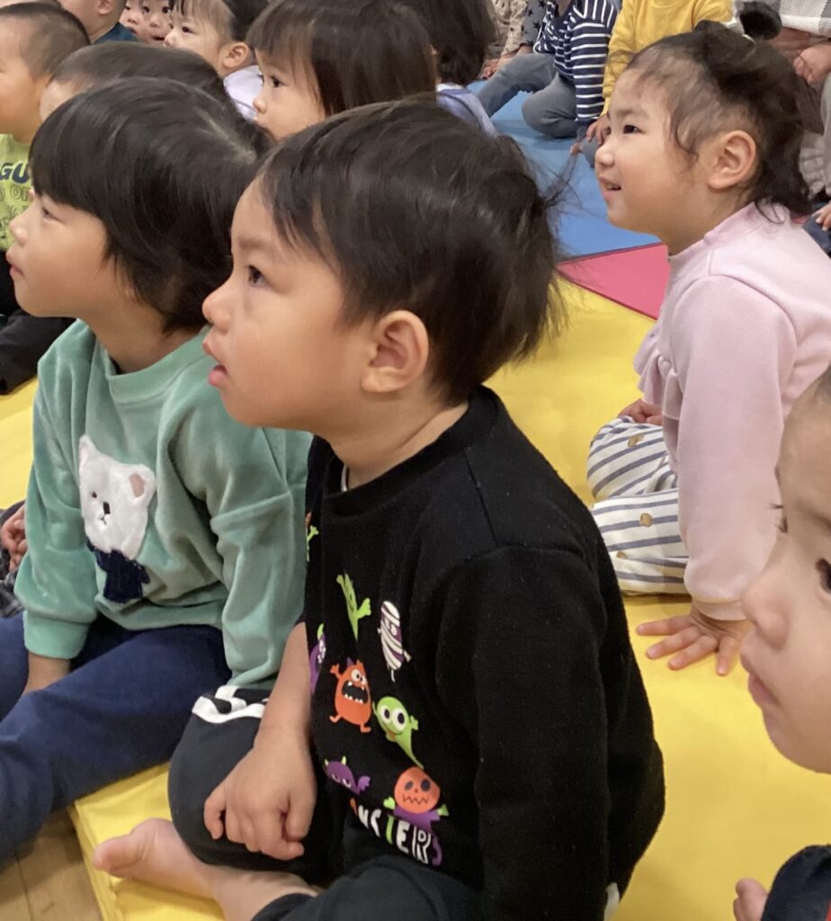 楽しいお話に真剣な表情を浮かべていました。色んな動物が登場すると嬉しい・楽しい気持ちになり、大きな声で笑いながら観ていました。