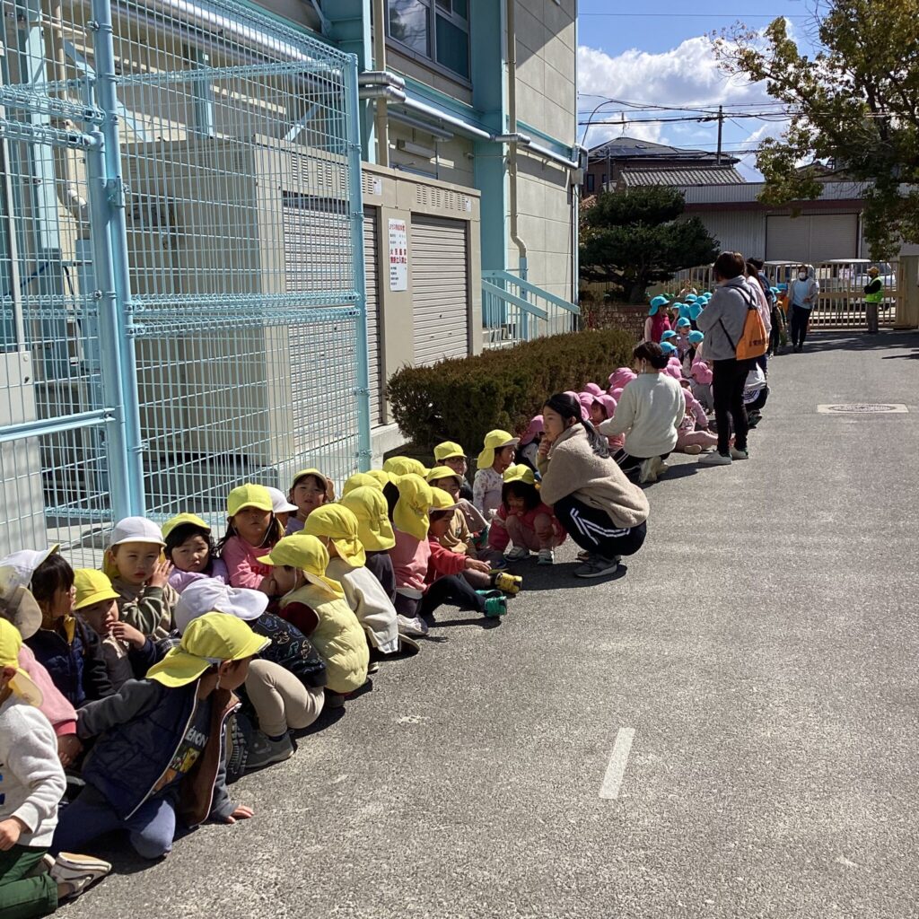 園庭に出てクラスごとに集合し、人数点呼をした後、隣接する公園へ二次避難。