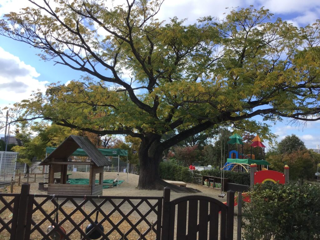 園庭の大きな木が、みんなの暑さを和らげてくれています。