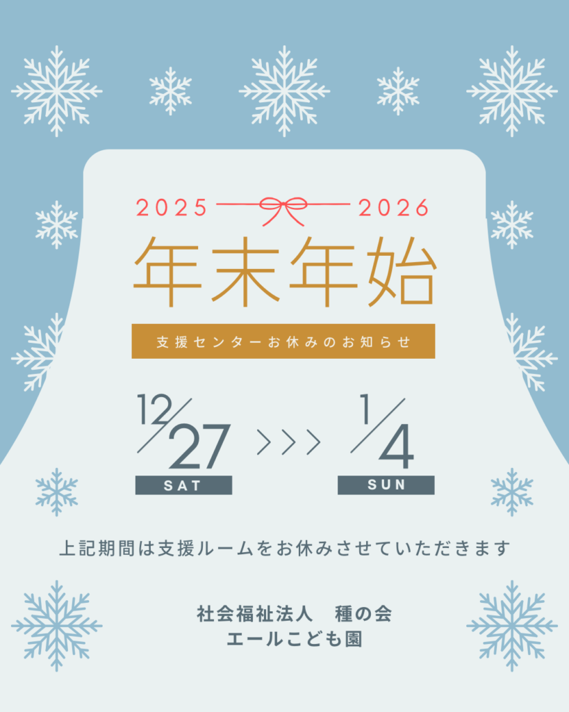 支援ルームは12月27日(土)~1月4日(日)の期間、お休みとさせていただきます。
